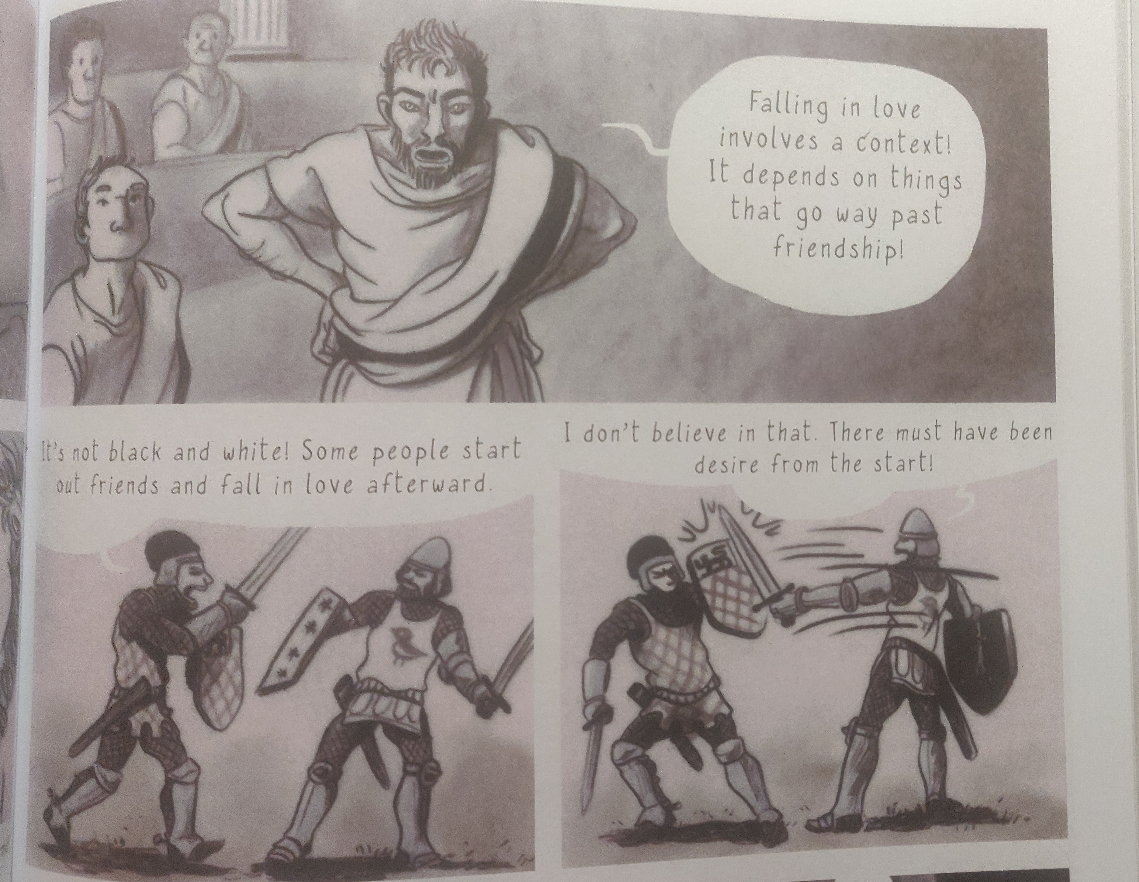 Julie Maroh’s Body Music includes an argument between friends. As the argument starts, they’re sitting in a modern-day Montreal park. The words stay modern as the friends get angrier, but the art shifts—from beer bottles and rumpled button-up t-shirts to Roman orators in the senate, medieval swordsmen bashing each other’s shields, and on through history. Since reading those pages, I keep thinking about the way I see myself when I’m talking. When I’m “defending” a point. When I’m arguing. Maroh writes what these characters are saying, but they draw how these characters are seeing themselves—the imagined poses they’re taking up.