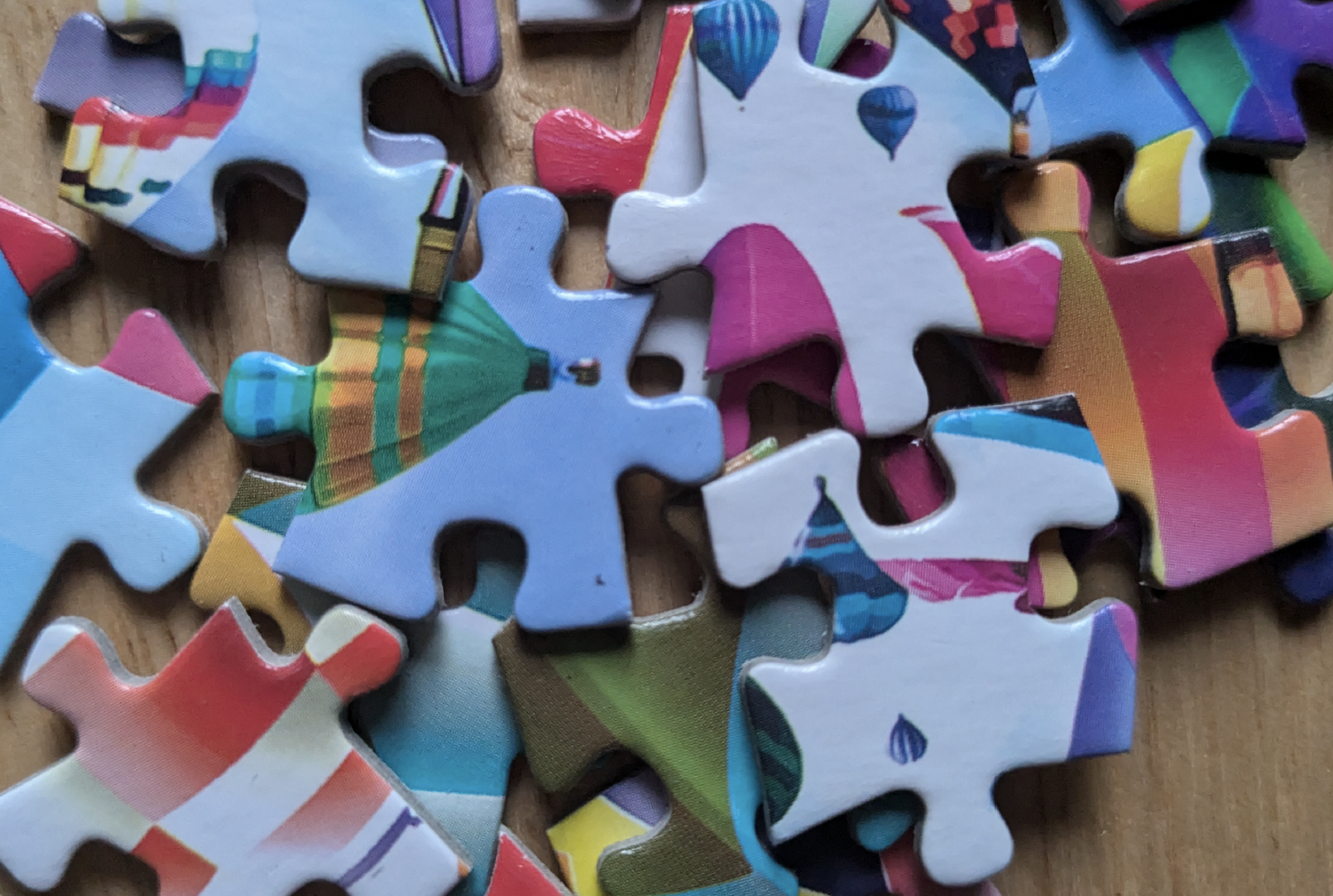 A few nights ago I dreamed of puzzle pieces. And not just any ones: these puzzle pieces, which I put together on Sunday in one long rush with my partner and our friend Natalie. It was a lovely afternoon of of cheese, crackers, and sliding the colors around. Feeling how they clicked together, how they didn’t. Not here a puzzle piece says. And then eventually it chuckles yep.